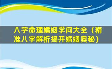 八字命理学,又称四柱预测学,是古代中国人民的关于人出生时间与命运的关系的学问。其中,婚姻作为人生大事,自然也成为八字命理学中重要的组成部分。